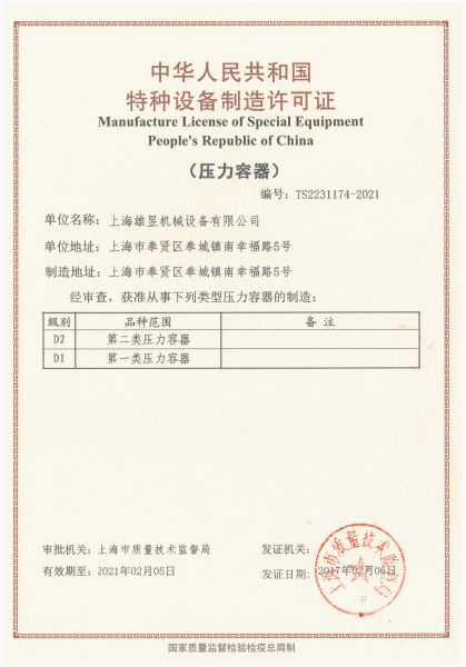 | 持证单位: 上海雄昱机械设备有限公司 |