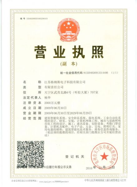 | 持证单位: 江苏格纳斯电子科技有限公司 |