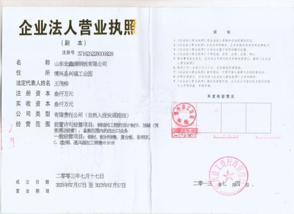 | 持证单位: 山东宏鑫源钢板有限公司 |